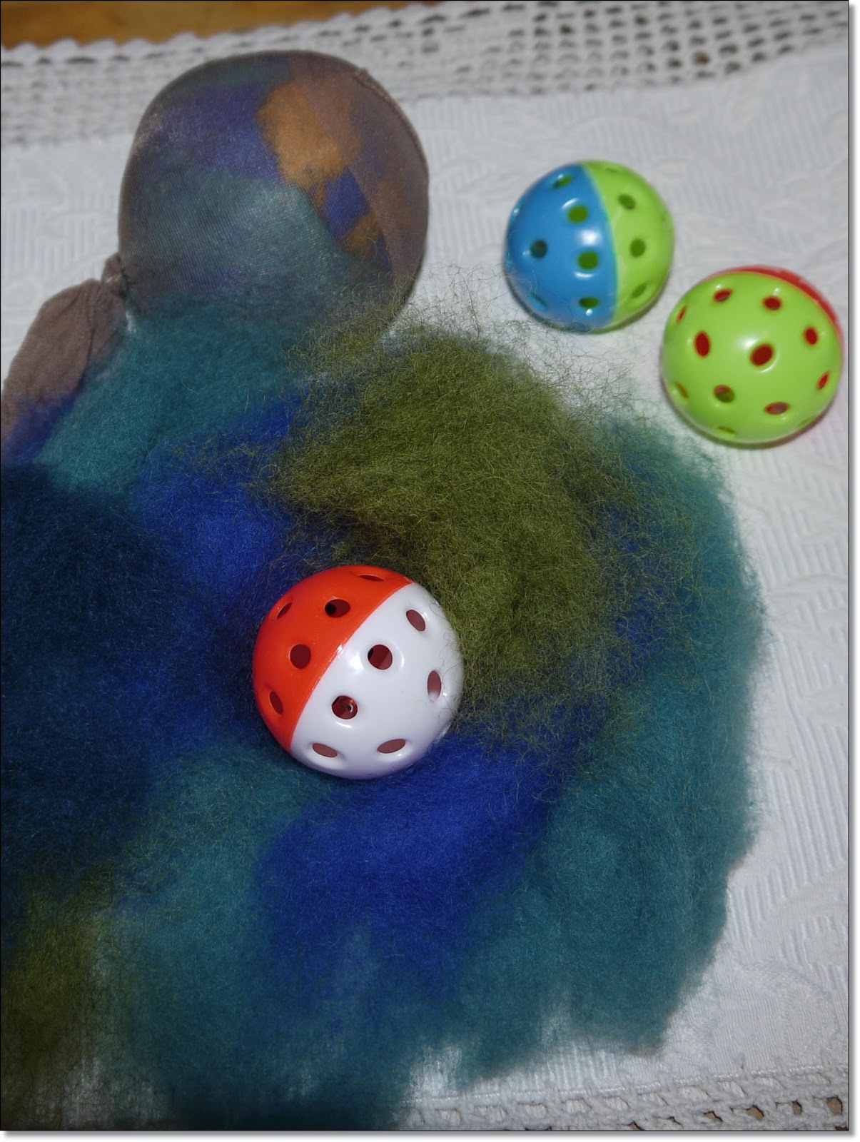 Plastballene fra dyrebutikken ble pakket inn i ull. og plassert i en nylonstrømpe. Alle tre ble tovet i maskinen på en gang.